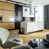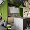 A kirobbanó életerőt megtestesítő színekhez a semleges hátteret a padlót és a szekrényeket borító világos színű faburkolat adja.